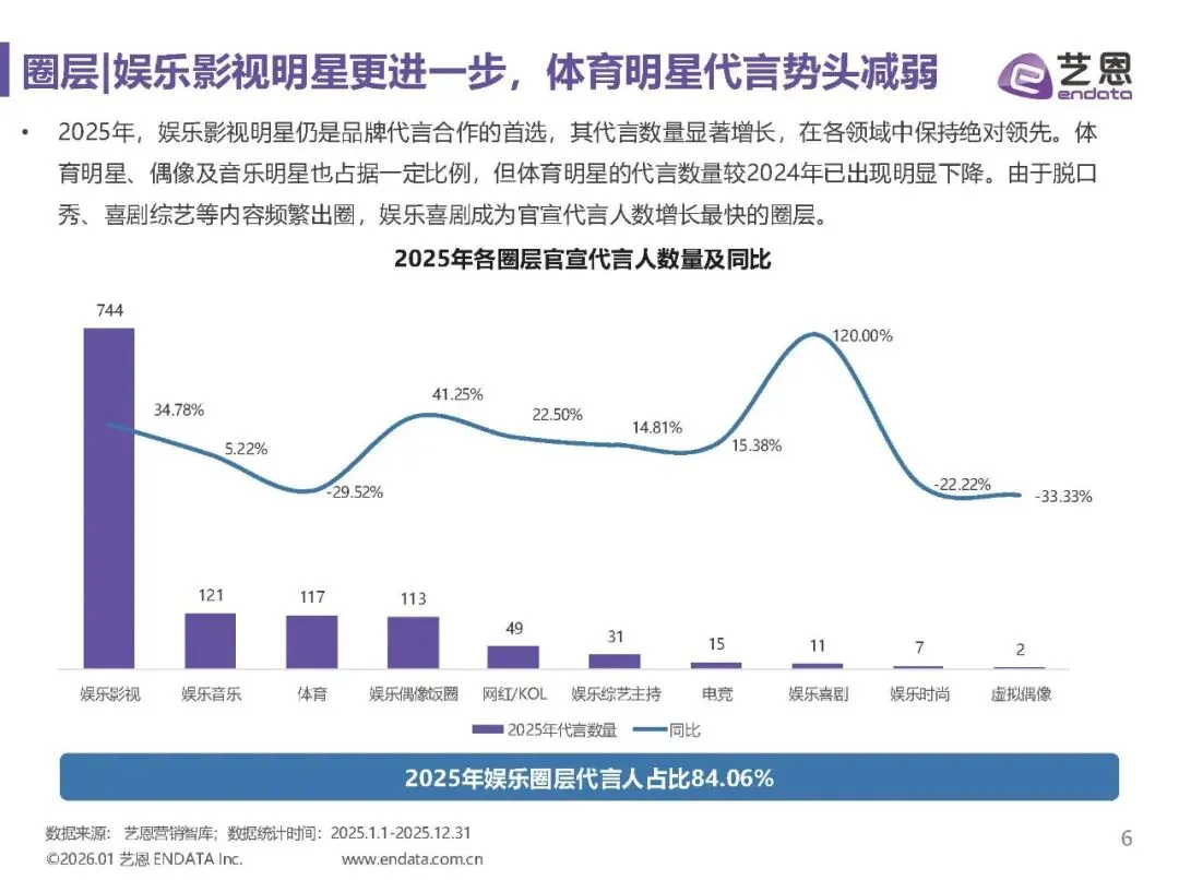 娱乐影视明星仍是代言首选,占比高达84.06%,而体育明星代言势头减弱,转向长效合作。