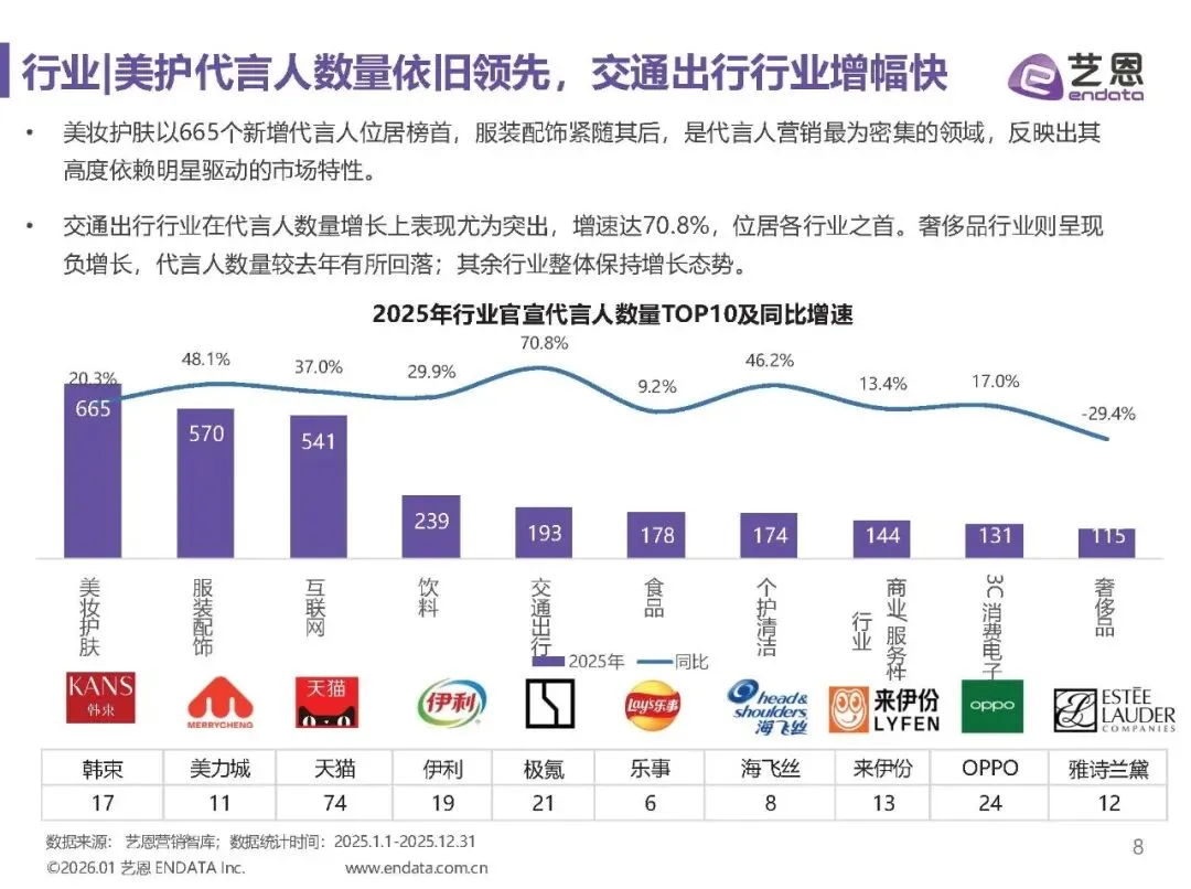 美妆护肤与服装配饰行业代言人数量领先,交通出行行业增幅显著,达70.8%。