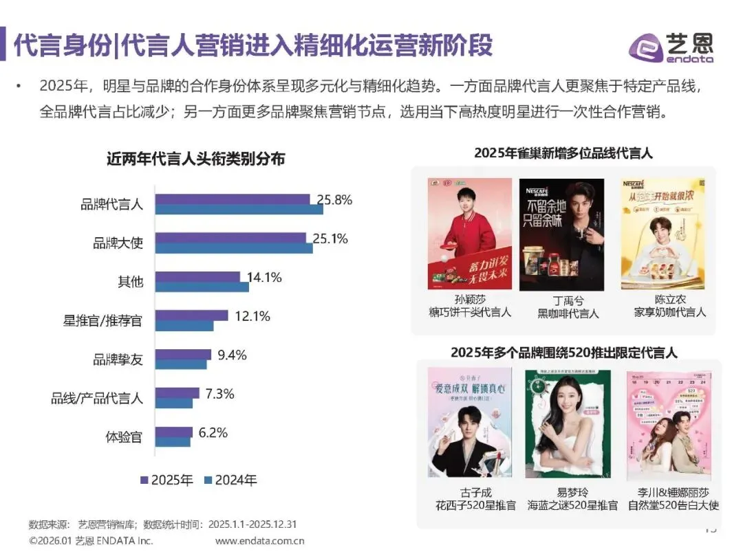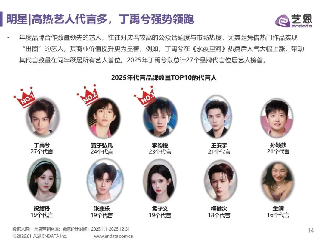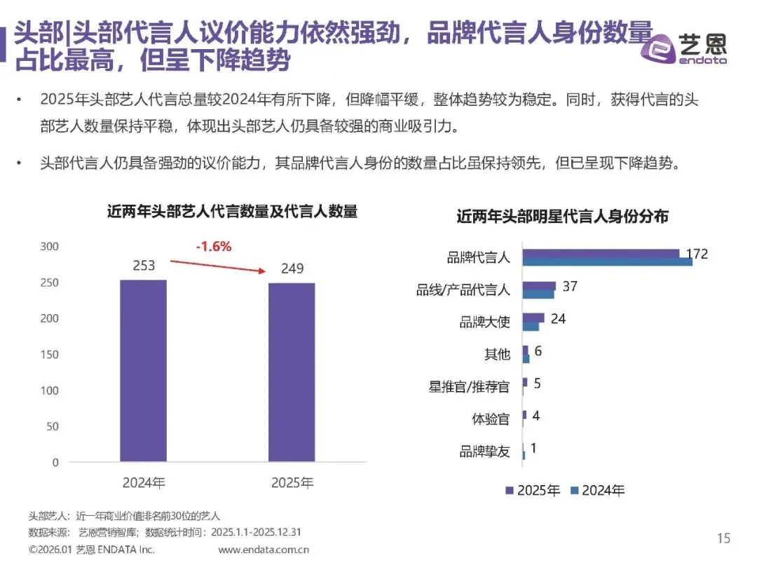 男性与中青年艺人主导市场,代言资源向中腰部倾斜,头部艺人代言份额下降。