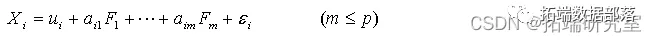 因子分析是一种数据简化的技术。它通过研究众多变量之间的内部依赖关系,探求观测数据中的基本结构,并用少数几个假想变量来表示其基本的数据结构。这几个假想变量能够反映原来众多变量的主要信息。原始的变量是可观测的显在变量,而假想变量是不可观测的潜在变量,称为因子。设p个变量,则因子分析的数学模型可表示为: