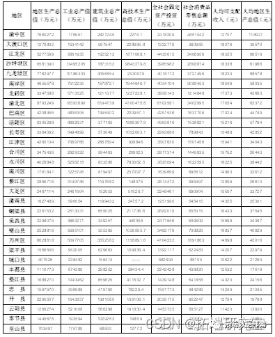 本文选取了重庆市38个区县作为样本进行分析,目的在于探索如何基于R统计软件的因子分析和聚类分析方法研究地区经济发展。具体数据如下: