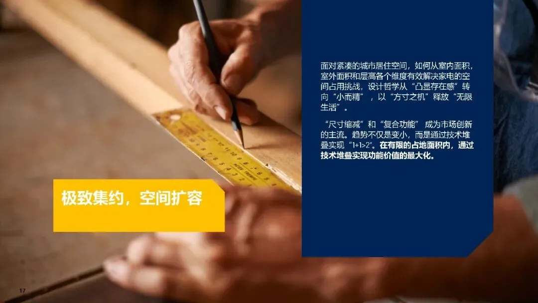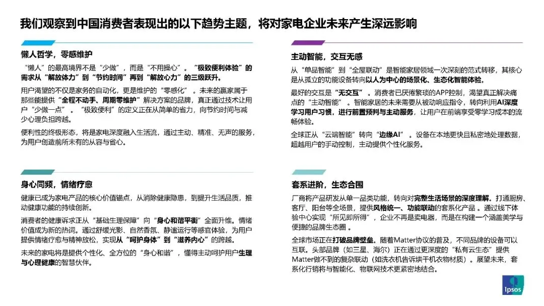 报告通过趋势研究框架与1200份样本调研,总结十大核心趋势:品类裂变升级,从家庭范畴向个人场景细分;极致集约,以“小而精”和复合功能扩容空间;美学隐形,追求与家居融合的“去工业感”设计;参数退场,体验至上,关注生活痛点与感官叙事;懒人哲学,从解放体力到“零感维护”;身心同频,健康功能向情绪疗愈延伸;主动智能,从单品到全屋联动,实现无感交互;套系进阶,构建品牌生态圈;服务前置,向“家电即服务”转型;祛魅存真,价值回归,国产品牌迎发展窗口。