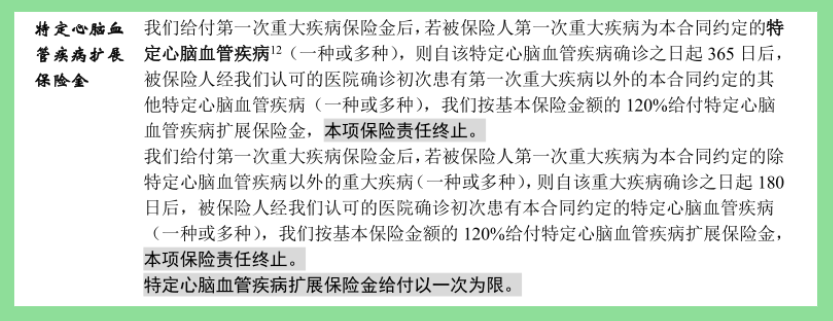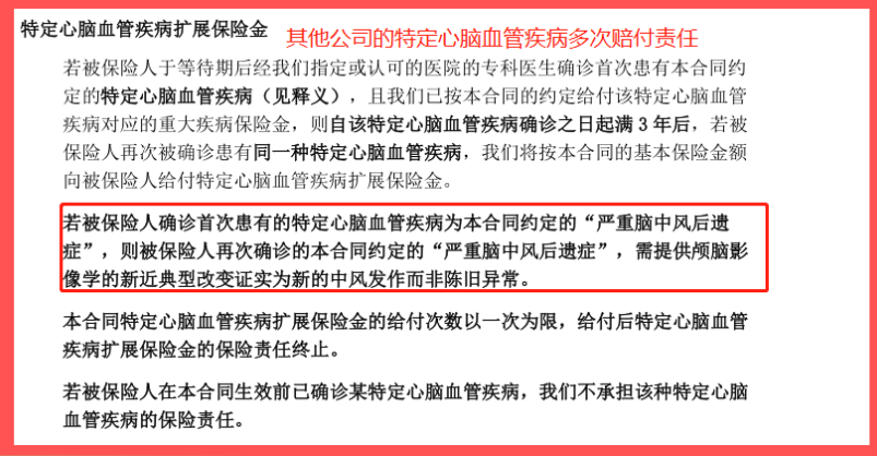 相对于其他重疾中的特定心脑血管疾病多次赔付的责任看,人保这款的心脑血管额外赔付宽松不少,比如等待期只有365天,而不是其他要求的三年,又或是不需要严重脑中风后遗症必须经影像学扫描,确定是新发疾病等严苛的要求,有点类似特定心脑血管疾病的重疾多次赔付且不分组的产品了,有心脑血管类家族遗传倾向的朋友们可以考虑下这个。