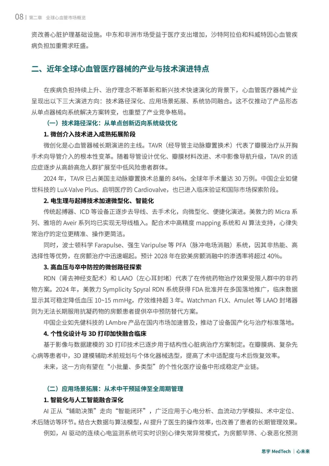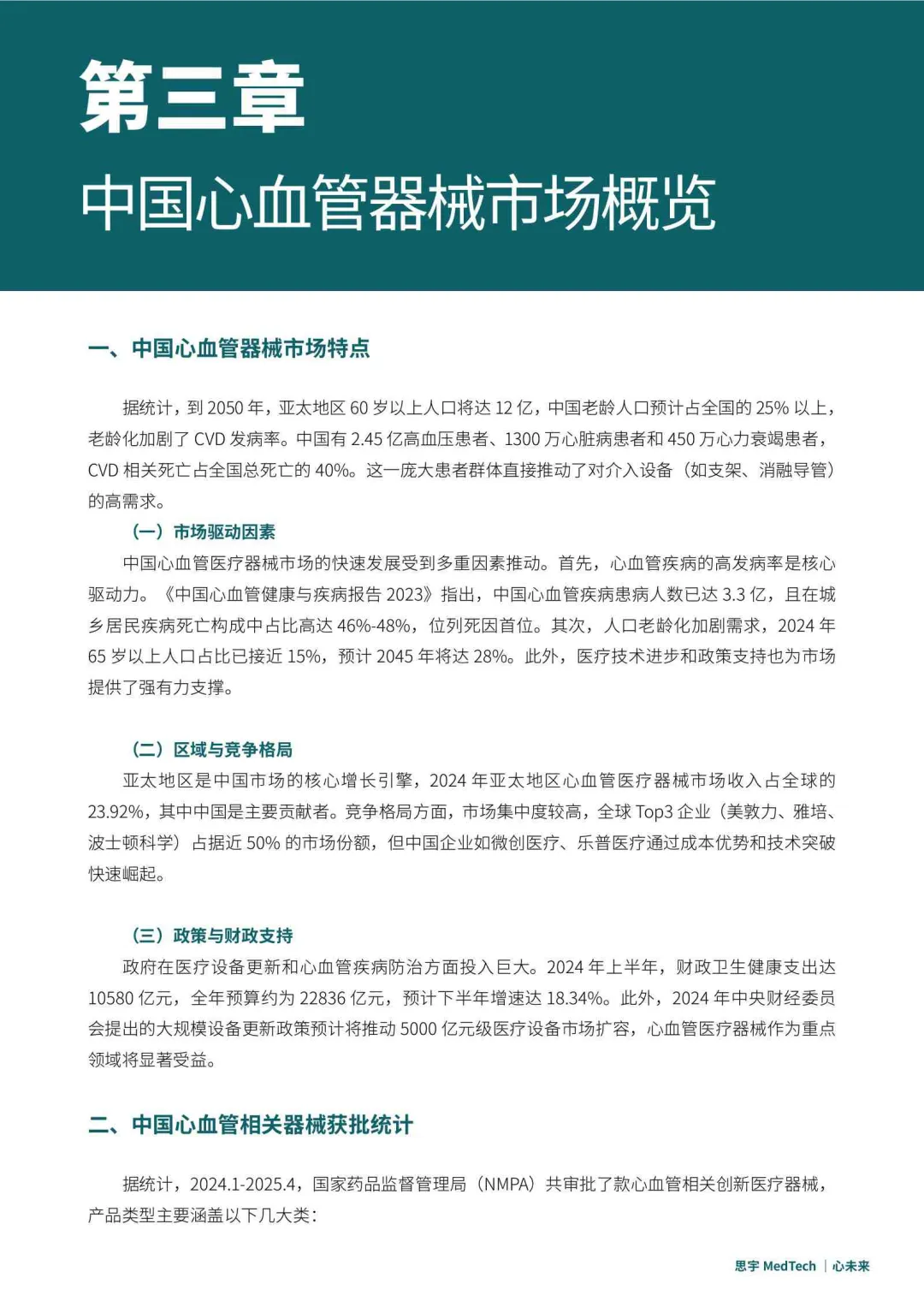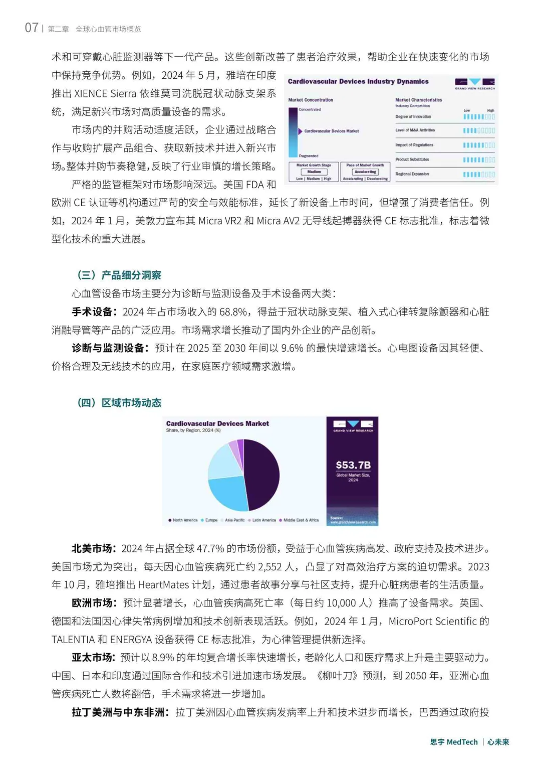 核心增长动力主要来自全球心血管疾病负担的不断加重,其中美、欧地区是主要高发区,同时微创技术、AI结合影像监测、可穿戴设备等技术创新,以及患者对微创手术的偏好提升,加上新兴市场医疗可及性逐步改善,共同推动市场扩容。区域格局上,北美仍是最大市场,2024年占比达47.7%,欧洲市场需求保持稳定,亚太地区则以8.9%的年复合增长率成为增长最快的区域,中国、日本、印度作为亚太核心市场,贡献了主要增长份额,尤其中国市场的崛起,成为全球行业增长的重要引擎。