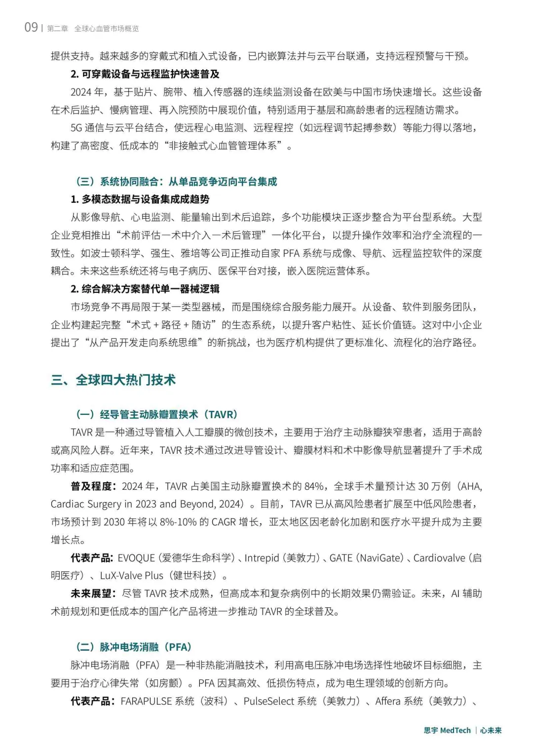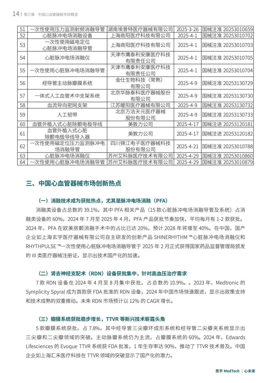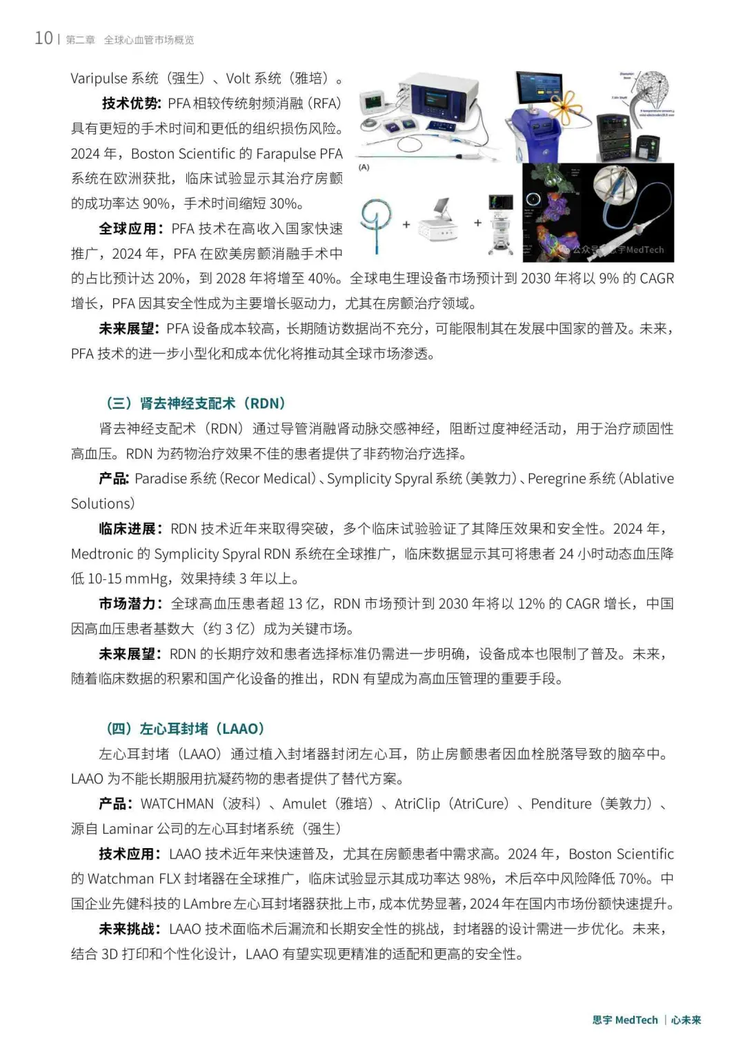 当前核心技术趋势清晰,微创化、智能化、个性化、系统协同融合成为主流方向,其中智能化发展尤为突出,AI与影像监测、手术导航的深度融合,搭配数字孪生术前规划,大幅提升了手术精准度,血管介入手术机器人更是实现了亚毫米级远程控制,成为行业热门赛道。代表性技术涵盖多个关键领域,TAVR即微创瓣膜置换技术已广泛应用于临床,PFA作为非热能房颤消融技术,凭借安全高效的优势快速普及,RDN为顽固性高血压患者提供了非药物治疗新选择,LAAO可有效预防房颤患者卒中风险,人工心脏则为终末期心衰患者提供了生命支持,这些技术目前均已进入临床普及阶段,且国产化产品获批速度不断加快,逐步打破进口垄断。