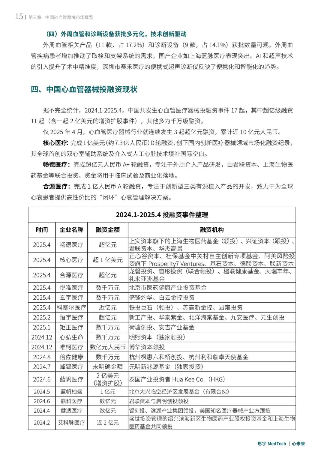 《2025 全球心血管创新年度白皮书》重点解读了全球及中国心血管医疗器械领域的发展态势。2024年全球市场规模已达536.7亿美元,预计2025至2030年将以8.4%的年复合增长率稳步增长,中国超3.3亿的心血管疾病患病人数,成为驱动市场增长的核心力量。白皮书聚焦冠心病、心力衰竭等高发疾病的诊断、治疗及康复器械,重点凸显TAVR、PFA、RDN、LAAO等八大创新技术,当前行业正清晰呈现微创化、智能化、系统融合的发展特征,叠加血管介入手术机器人、AI影像引导等热门技术的快速渗透,行业创新活力持续释放。中国市场凭借老龄化加剧、政策持续扶持及国产化技术突破,发展势头迅猛,2024年1月至2025年4月累计获批64款创新器械,集采政策推动产品价格下行与国产替代加速,先健科技、阿迈特等企业已成为进口替代的核心力量。