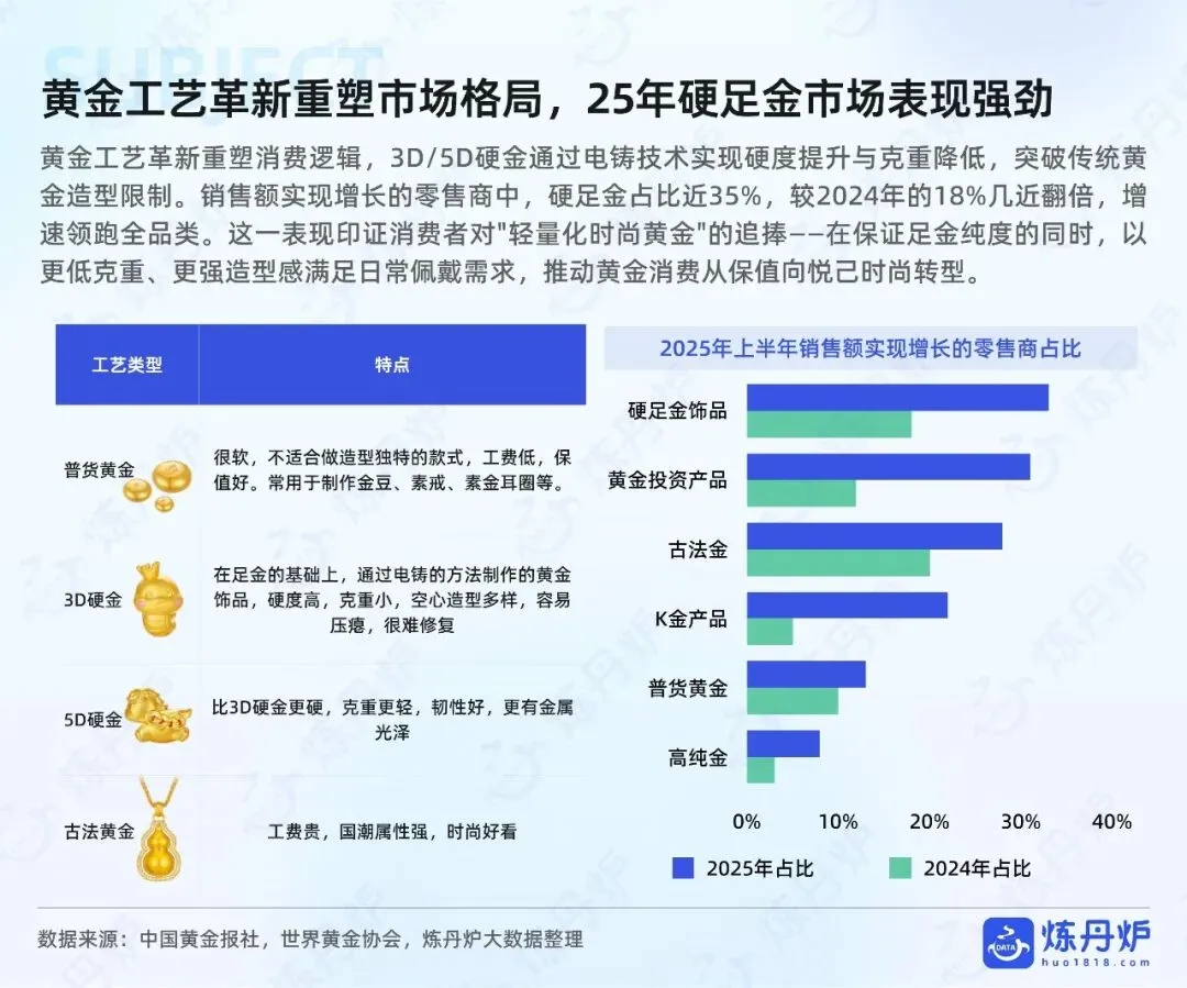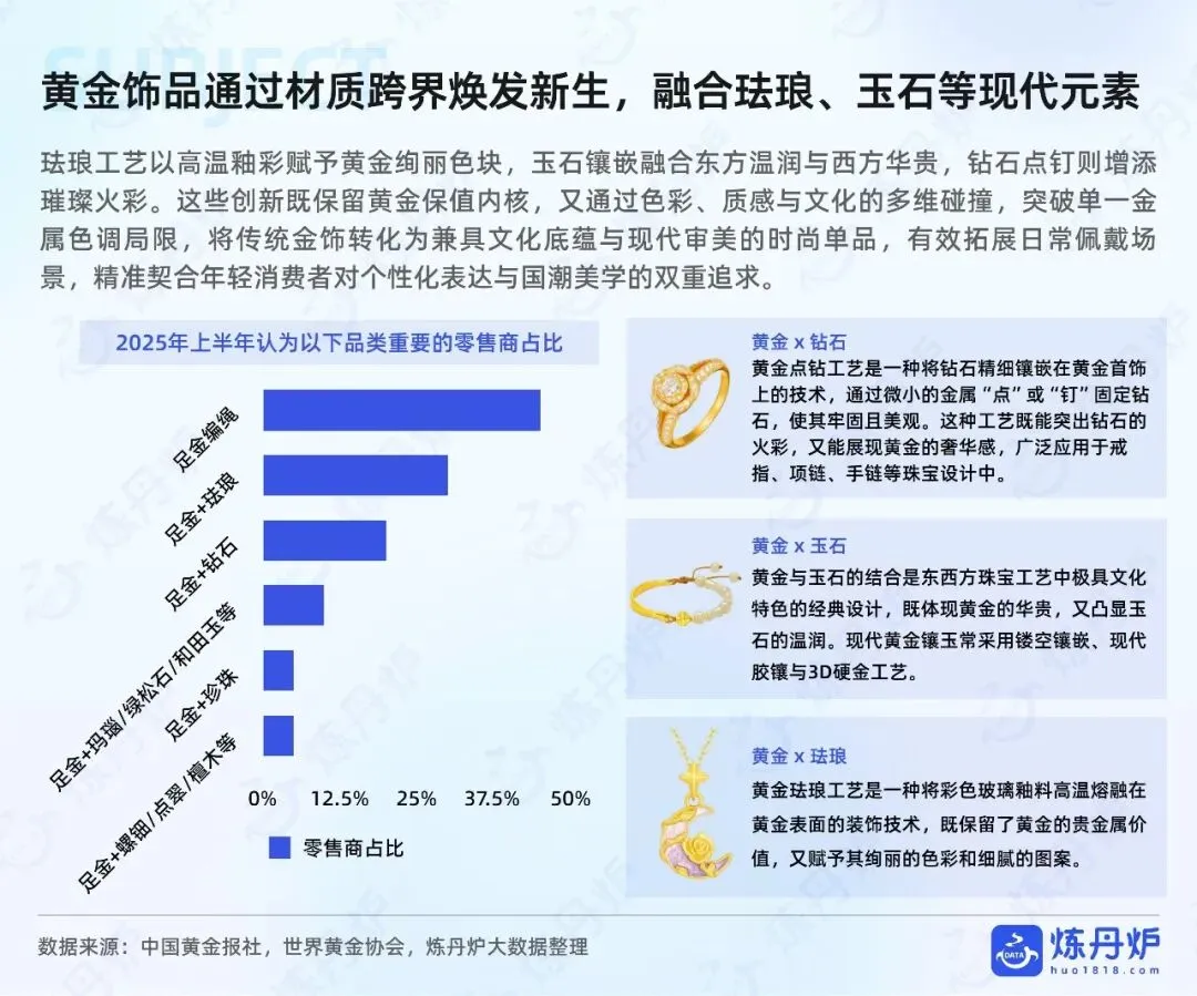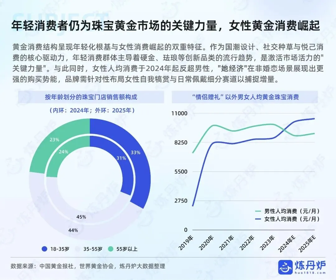 2026年黄金行业迎来消费与产业双重升级的发展新阶段,中国珠宝市场规模稳步增长,黄金凭借避险保值属性与国潮文化赋能,稳居品类主导地位且市场占比持续攀升,成为行业核心增长极。原材料价格上涨推动终端产品调价,税收政策精准适配黄金商品与金融双重属性,工艺革新则重塑消费逻辑,硬足金、古法金及材质跨界创新品类快速崛起,推动黄金消费从保值向悦己时尚转型。消费者需求呈现“理性保值+情感审美”双轮驱动特征,自戴需求大幅提升,年轻群体与女性消费成为市场核心驱动力,消费结构呈现“低价高频”与“高价低频”并存的特点。行业竞争格局分化,头部品牌依托规模优势与全渠道布局巩固地位,高端品牌则凭借古法工艺与文化溢价实现快速增长。同时,轻量化黄金产品、IP联名金饰、个性化定制服务等新趋势持续涌现,推动黄金行业向年轻化、日常化、高端化多元发展,行业长期向好基本面稳固。