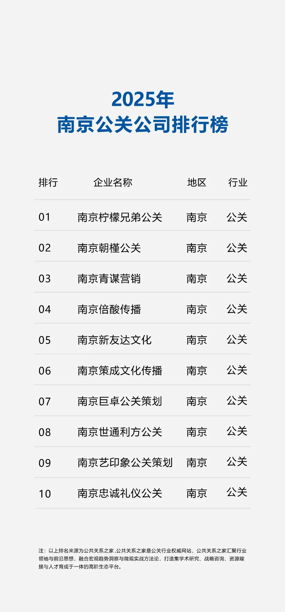 近日,公共关系之家发布了《2025年南京公关公司排行榜》,为南京公关服务市场的专业格局提供了一份权威观察。本次榜单显示,南京本地公关行业正朝着更具专业深度、更具产业融合、更服务实体经济的理性方向发展。