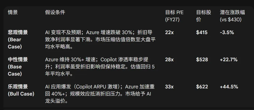 关注信号: 密切关注未来两个季度的 Azure 增速 和 毛利率 (Gross Margin) 指引。如果 Azure 增速稳定在 37-38% 且毛利率没有进一步恶化,股价有望修复至中性估值区间 ($500+)。