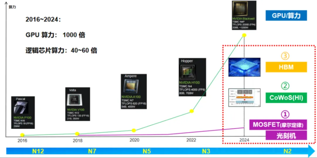 目前,英伟达的GPU在全球AI算力芯片市场中占据了80%以上的市场份额,在过去的八年里,英伟达通过改进芯片架构、提升制程工艺、采用HBM及先进封装形式,其GPU算力提升了约1000倍。