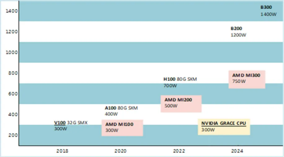 而AI算力芯片市场的另一主要厂商AMD,在2020年至2024年迭代的GPU芯片功耗也大幅增加,由MI100的300W增加至MI300的750W。