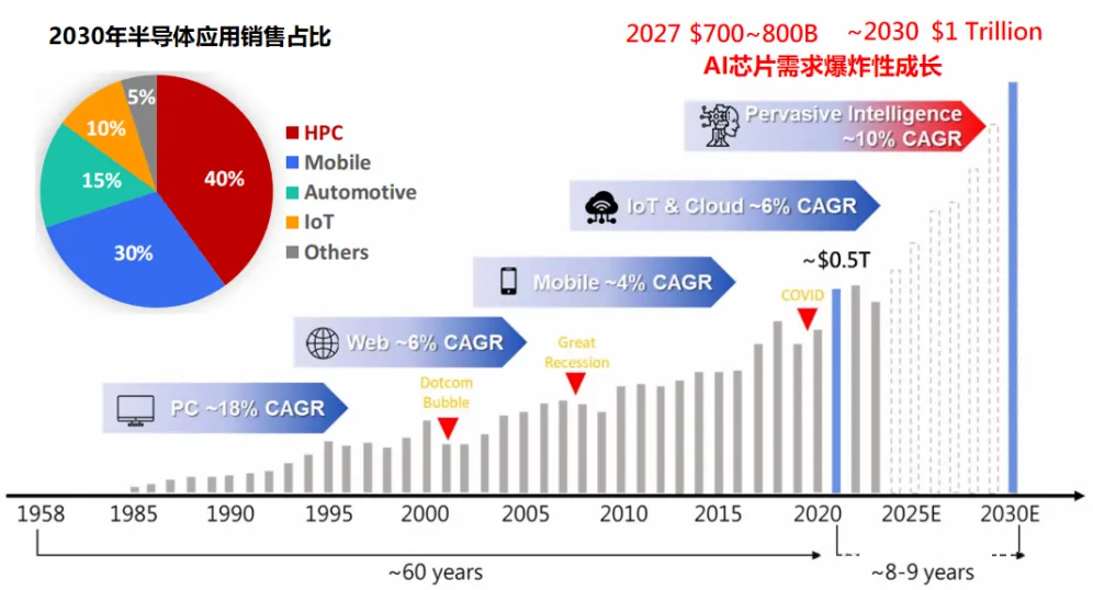 由上文可知,2015年到2024年全球数据量增加了122 ZB,相应的全球GPU市场规模增加了1120亿美元,GPU产品也经历了从Pascal到Blackwell五种架构的进化。依此推算,在2024年到2030年,全球数据量规模将增加870ZB,对应的全球GPU市场规模将有数倍增长空间。根据中国台湾工研院预估,2030年算力芯片将占据整个半导体应用销售的40%,从而推动全球半导体市场规模在2030年达到1万亿美元,算力芯片是未来全球半导体市场规模增长的主要驱动力。