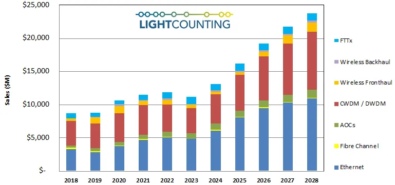 2018-2028E 全球光模块销售额(百万美元)
