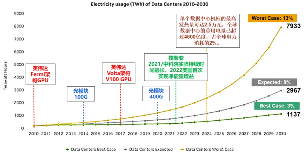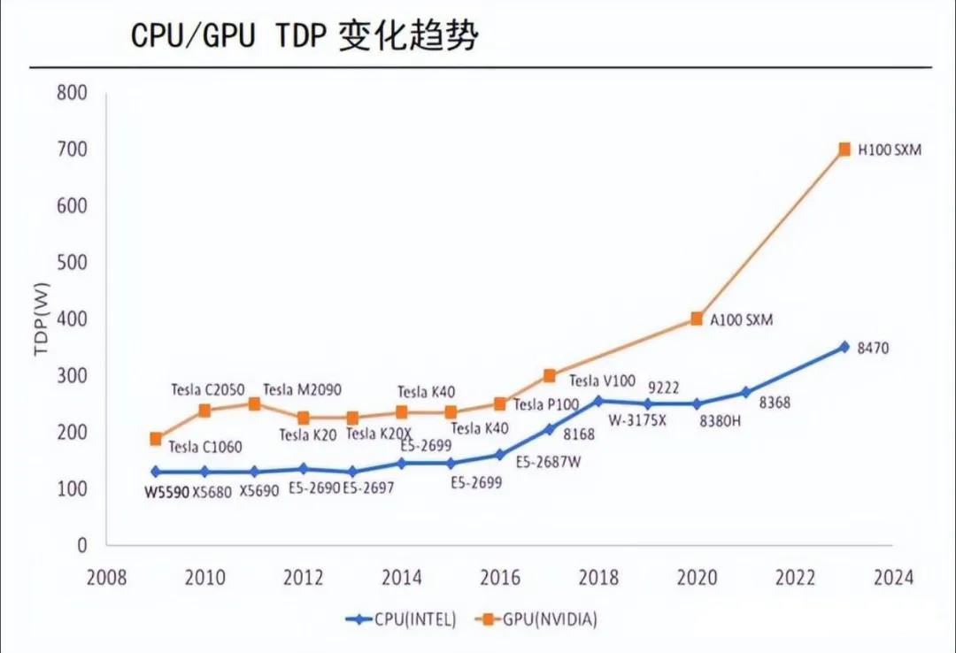 在算力提升的同时,芯片功耗也在不断增加,根据亚太芯谷科技研究院统计,英伟达最新推出的GB200芯片功耗达到了惊人的2700W,是其V100芯片功耗的近10倍。