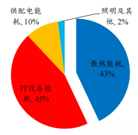 数据中心在消耗的庞大电能时,也会产生巨大的能耗,根据《绿色高能效数据中心散热冷却技术研究现状及发展趋势》统计,数据中心能耗主要由IT设备能耗、散热能耗、供配电能耗和照明及其他能耗组成,其中,IT设备能耗、散热能耗是主要的能耗,散热能耗占比达到43%。
