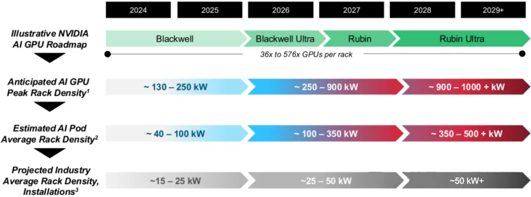 以英伟达2024年四季度量产的GB200 NVL服务器为例,单颗B200芯片TDP 1200W,GB200系统芯片TDP更上看2700W(1个Grace CPU+2个B200 GPU),现行的3D VC气冷散热解热瓶颈约在1000W,超出1000W以上采液冷散热效果较佳,因此需要全面升级液冷散热,并配合其他散热技术共同作用。2025年,英伟达的B300芯片TDP进一步扩大到1400W,AMD GPU Server芯片下世代功耗预期也将突破千瓦水平。相对应的英伟达下一代芯片单机柜能耗或超过1MW,预计2028年左右推出Rubin Ultra AI GPU峰值机架密度功耗最高或超过1000kW,散热已经成为AI芯片发展的关键。