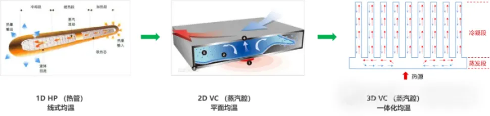 前文提到的热管及VC散热均为两相均温技术,其中热管是一维线式均温,VC是二维平面均温,下面介绍的3D VD则是三维一体式均温。