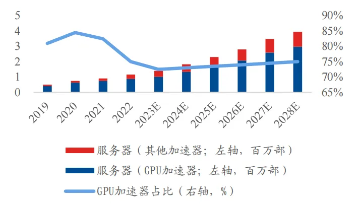 加速器服务器规模及 GPU 服务器占比(左侧百万部;右侧 %)