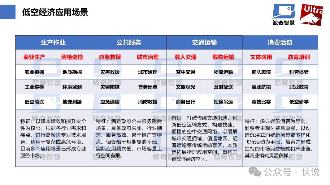 低空经济是以先进飞行器为载体,依托新型基建与空域管理,融合多产业的三维经济形态。其涵盖生产作业、公共服务、交通运输、消费活动四大核心场景。