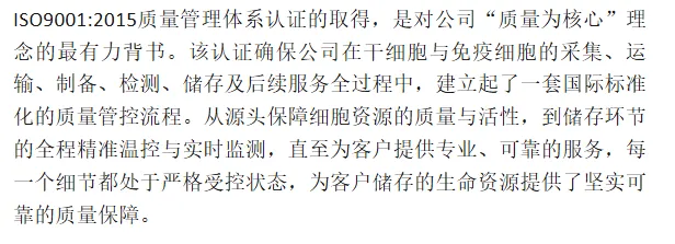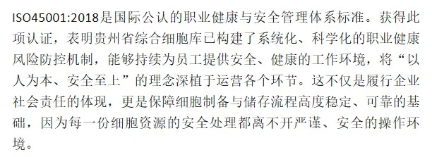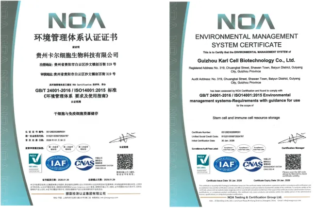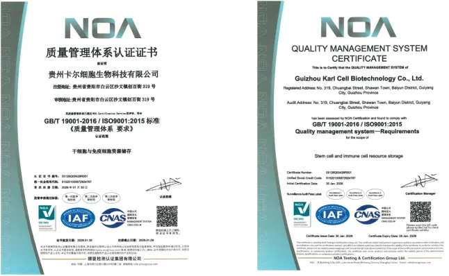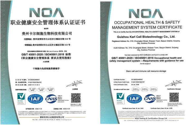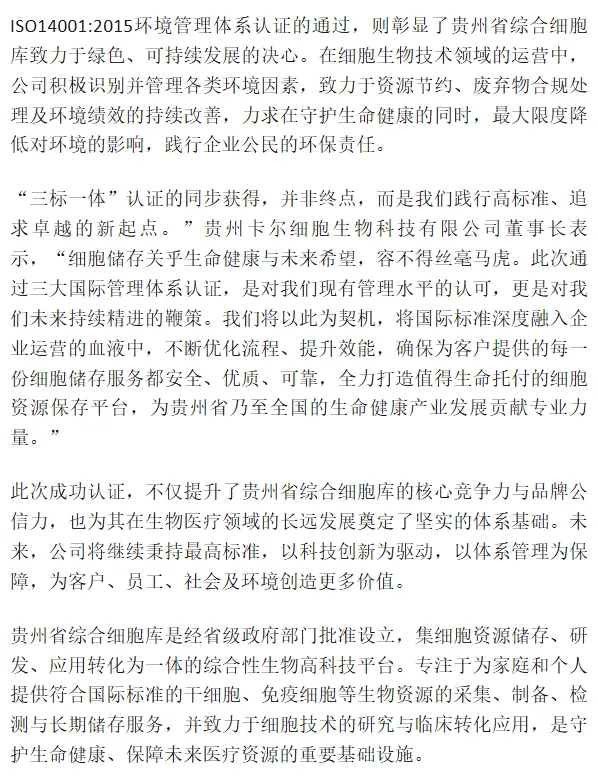 贵州省综合细胞库(贵州卡尔细胞科技有限公司)于2026年1月30日再次成功获得三项国际权威管理体系认证,包括:职业健康安全管理体系认证(ISO45001:2018)、质量管理体系认证(ISO9001:2015)以及环境管理体系认证(ISO14001:2015)。此次认证范围全面覆盖了公司的核心业务——干细胞与免疫细胞资源储存。这标志着贵州省综合细胞库在细胞储存服务的安全性、质量规范性、环境友好性及员工职业健康保障方面,均已建立起与国际先进标准接轨的系统化管理体系,综合运营管理水平迈上新台阶。