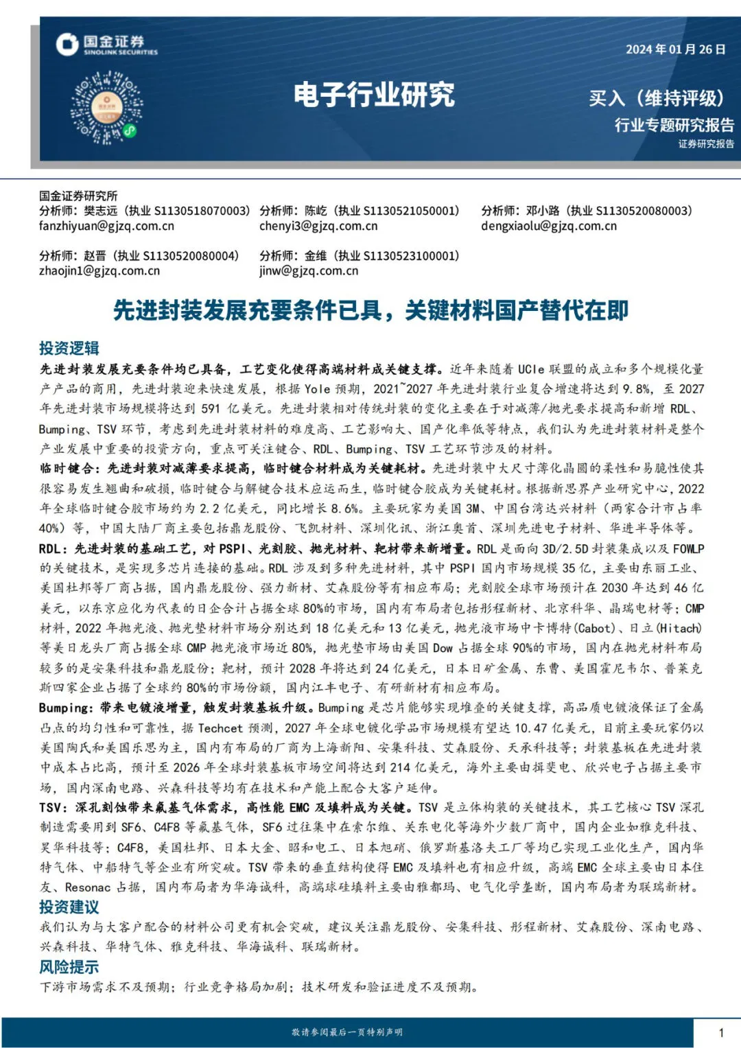 下载报告:电子行业研究:先进封装发展充要条件已具,关键材料国产替代在即