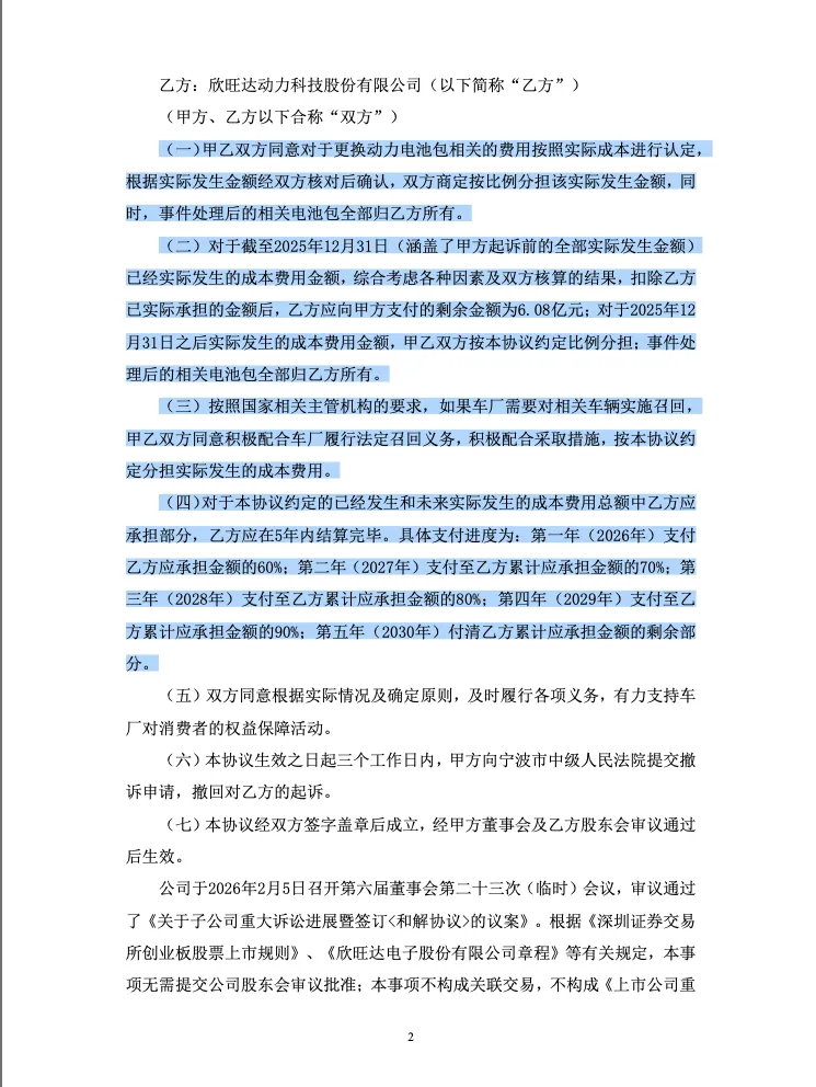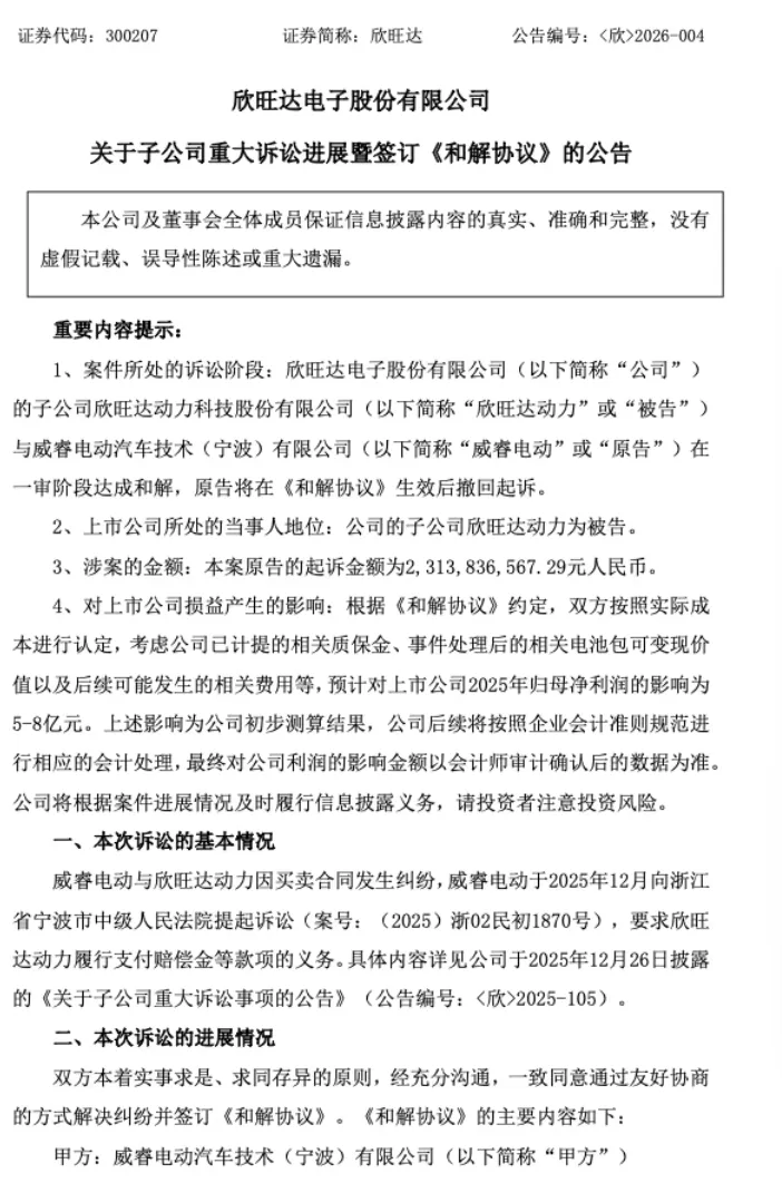 新华AUTO:官司不打了!欣旺达与极氪子公司达成和解。2月6日,欣旺达电子股份有限公司发布“关于子公司重大诉讼进展暨签订《和解协议》的公告”。