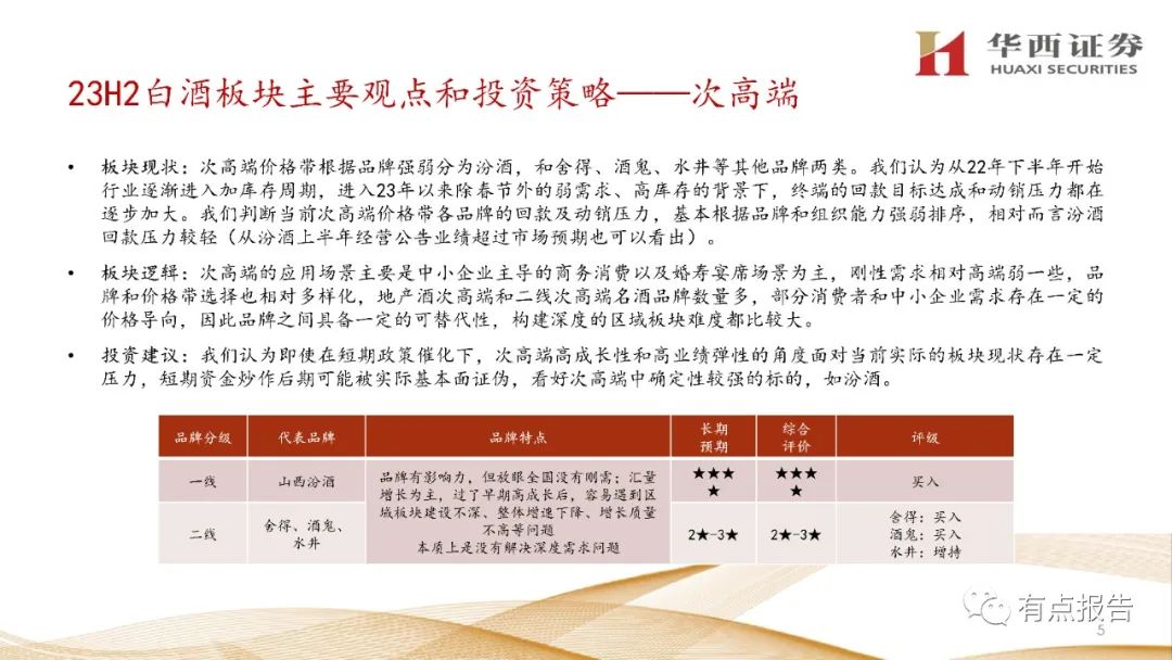 产业角度——行业仍在加速出清,行业品牌集中化趋势加强。根据国家统计局的数据,2023年1-6月全国规上白酒企业产量209.7万千升,同比-14.8%。对行业和基本面的综合判断下我们认为,23年以来各价位段龙头还能做到持平或增长,其他品牌实际动销在持平或下滑的边缘,中小企业在持续出清。