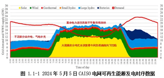 2024年3月7日至6月30日期间,美国加州CAISO电网实现了“百日绿电”的高比例可再生能源稳定运行。在116天中有98天实现了每日至少部分时间可再生能源发电功率超过用电负荷的情况,平均持续时长约4.8小时/天。以下图为例,2024年5月25日,午间光伏出力超过最大负荷,可再生能源富余发电量中约半数输往美国西部其他州,剩余大部分则储存在储能系统中。傍晚至夜间,太阳能出力骤降,储能开始大规模放电,同时,风电、水电、地热电站等提供相对稳定出力,天然气发电、外电作为必要补充。
