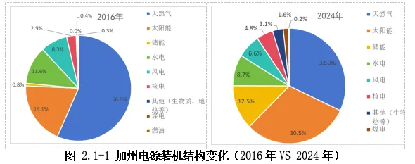 SB100法案提出后,加州以太阳能为主的可再生能源取得了飞速发展。2024年,加州可再生能源发电量占比56%,提前实现2026年50%的目标。光伏发电装机容量由1300万千瓦增长至3566万千瓦,装机占比由19.1%增长至30.5%,成为全州第二大电源,发电量占比约1/3;水电、风电、核电装机容量均有小幅增长,合计占比约20%。2016年到2024年,加州天然气发电装机容量减少160万千瓦,装机占比由56.6%下降至32%,发电量占比下降至35%左右。