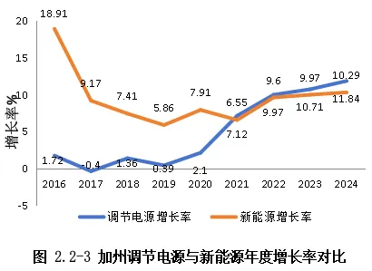 加州加大储能发展支持力度,储能实现爆发式增长。储能装机规模从50万千瓦,迅速增加至目前的1500万千瓦,增长30倍。目标到2030年,储能装机达到2500万千瓦,要求至少50%为4小时以上的长时储能。受此影响,近年来加州调节资源的增速高于新能源的增速,调节资源规模与新能源规模的比值由2016年的0.99上升到2024年的1.25,对新能源消纳起到了积极作用。