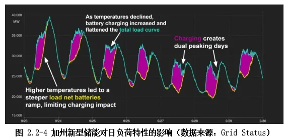 新型储能的快速发展,已深刻重塑加州电网的日负荷特性曲线,“鸭子”曲线被填平的特征日益凸显。电池充电有效平滑了日间负荷曲线,使午间电网运行更趋平稳。9月25日的数据清晰展现了这一趋势:计及充电负荷后,从正午至晚高峰期间总负荷仅上升约120万千瓦。若不考虑储能因素,午间实际净负荷会下降近千万千瓦再大幅攀升至晚高峰。