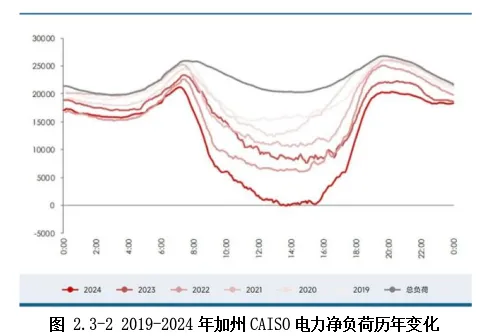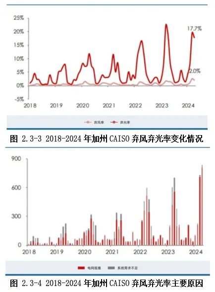 期间加州电力系统主要呈现三个特征:一是可再生能源发电量占比大幅提升,约占总用电量的70%,天然气发电量较去年同期大幅下降40%左右;二是现货市场价格显著降低,较2023年同期降幅约52.9%,主要是由于可再生能源挤占了天然气发电空间,拉低了市场的出清价格;三是弃光率大幅增加,2024年3-7月各月弃光率接近20%,远超其他月份5%左右的弃光率水平。