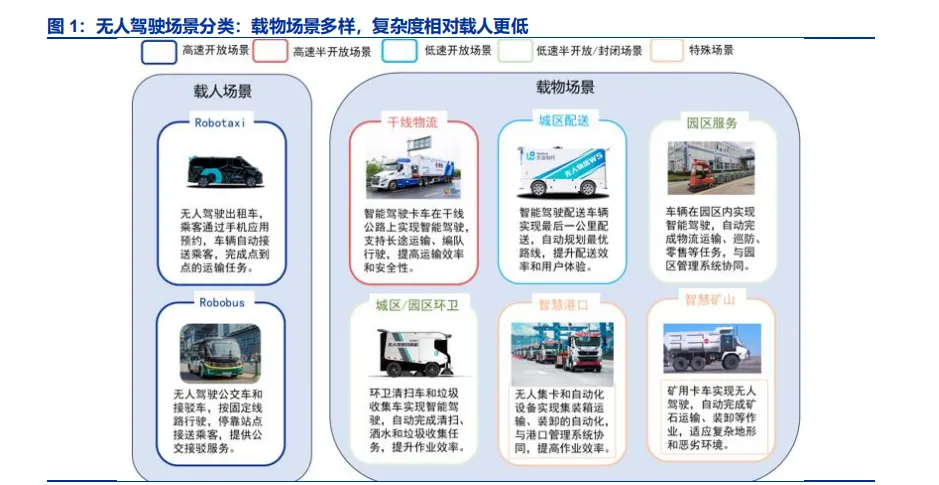 无人驾驶场景依据环境复杂度,可分为高速/低速场景,开放/封闭场景。无人驾驶场景可按速度与场景开放程度分类。载人的 Robotaxi 与 Robobus 为高速开放场景。载物端,干线物流属于高速半开放场景。城区快递配送属于低速开放场景,环卫服务属于低速半开放场景。无人矿卡、无人港口运输车则属于特殊场景。