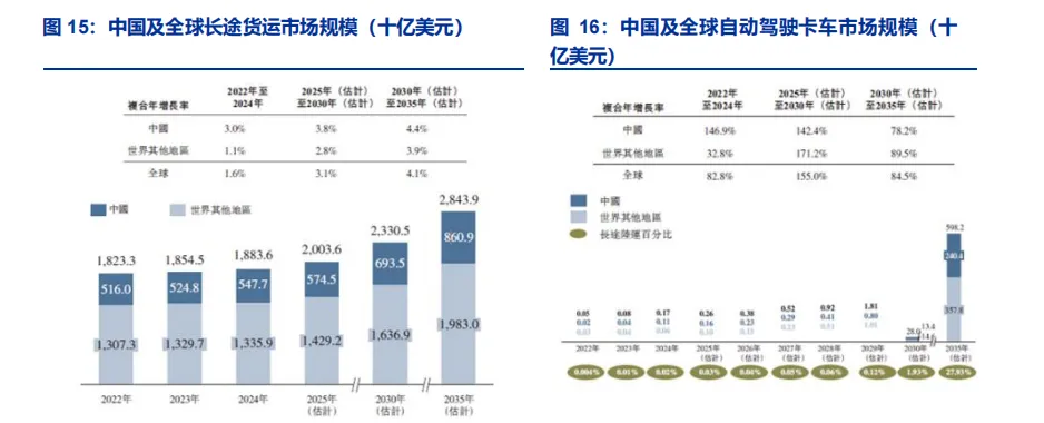 全球货运市场稳步提升,Robotruck 潜在市场空间巨大。根据小马智行招股书披露,全球长途陆运市场规模庞大且稳步增长,预计从 2022 年约 1.82 万亿美元增加至预计 2030年的 2.33 万亿美元。市场规模增长率处于提速过程中,预计未来 5 年中国市场复合增速3.8%,全球其他市场复合增速 2.8%。伴随无人渗透率提升,Robotruck 市场预计持续增长并在 2030 年迎来爆发,2025 年全球市场规模约 2.6 亿美元,预计 2030 年达到 280 亿美元,2035 年达到 5982 亿美元。