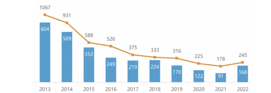 矿山作业面临着工艺流程复杂、灾害频发以及高事故风险的挑战。以煤炭这一重要矿产资源为例,随着安全生产意识的不断增强,中国煤矿的安全事故发生次数和伤亡人数在过去一段时间内总体呈现下降的趋势。2022 年两项指标出现回升,分别同比增加 85%和38%,反映当前安全问题依旧严峻。相较于美国等发达国家,中国在每百万吨煤炭生产中的人员伤亡率仍处于较高水平,表明矿区安全生产能力存在提升空间。