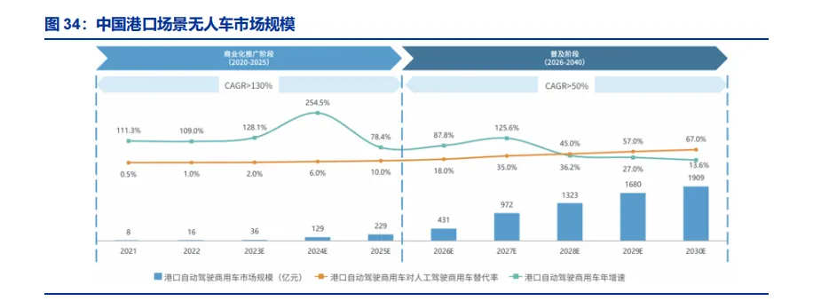 港口水平运输环节的人力依赖与效率瓶颈,催生了对无人运输车的需求。 传统集卡司机招工难、成本高、夜间作业效率低,且人工操作存在安全与标准化难题。无人港口运输车(包括 AGV、IGV 及无人集卡)可实现集装箱自动搬运,通过精准路径规划与 24 小时连续作业,显著提升吞吐效率、降低碳排放,是港口智能化与绿色化转型的核心抓手。亿欧智库预测在 2021 至 2025 年间,市场规模将以超过 130% 的复合年增长率增长。展望2026 至 2030 年,复合增长率预计将保持在 50% 以上,凸显港口自动驾驶商用车领域的显著增长潜力。