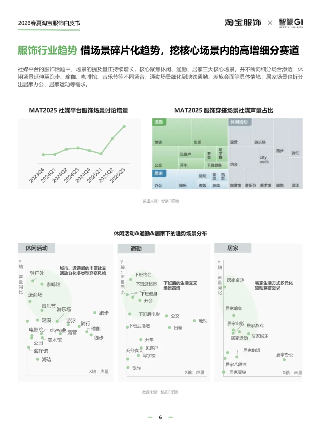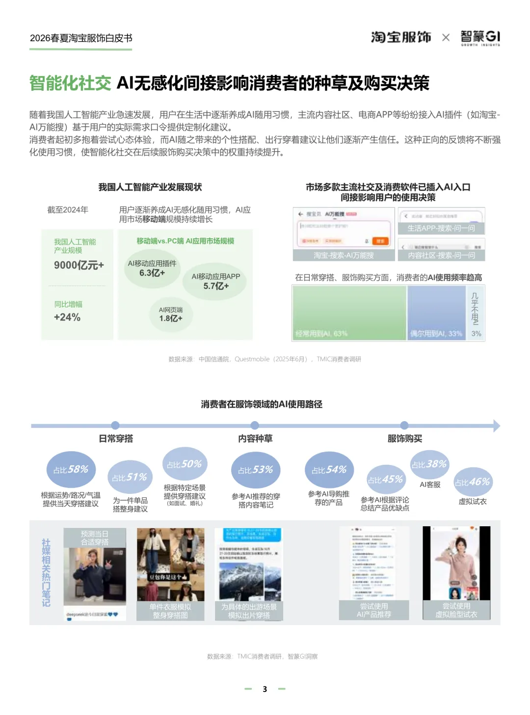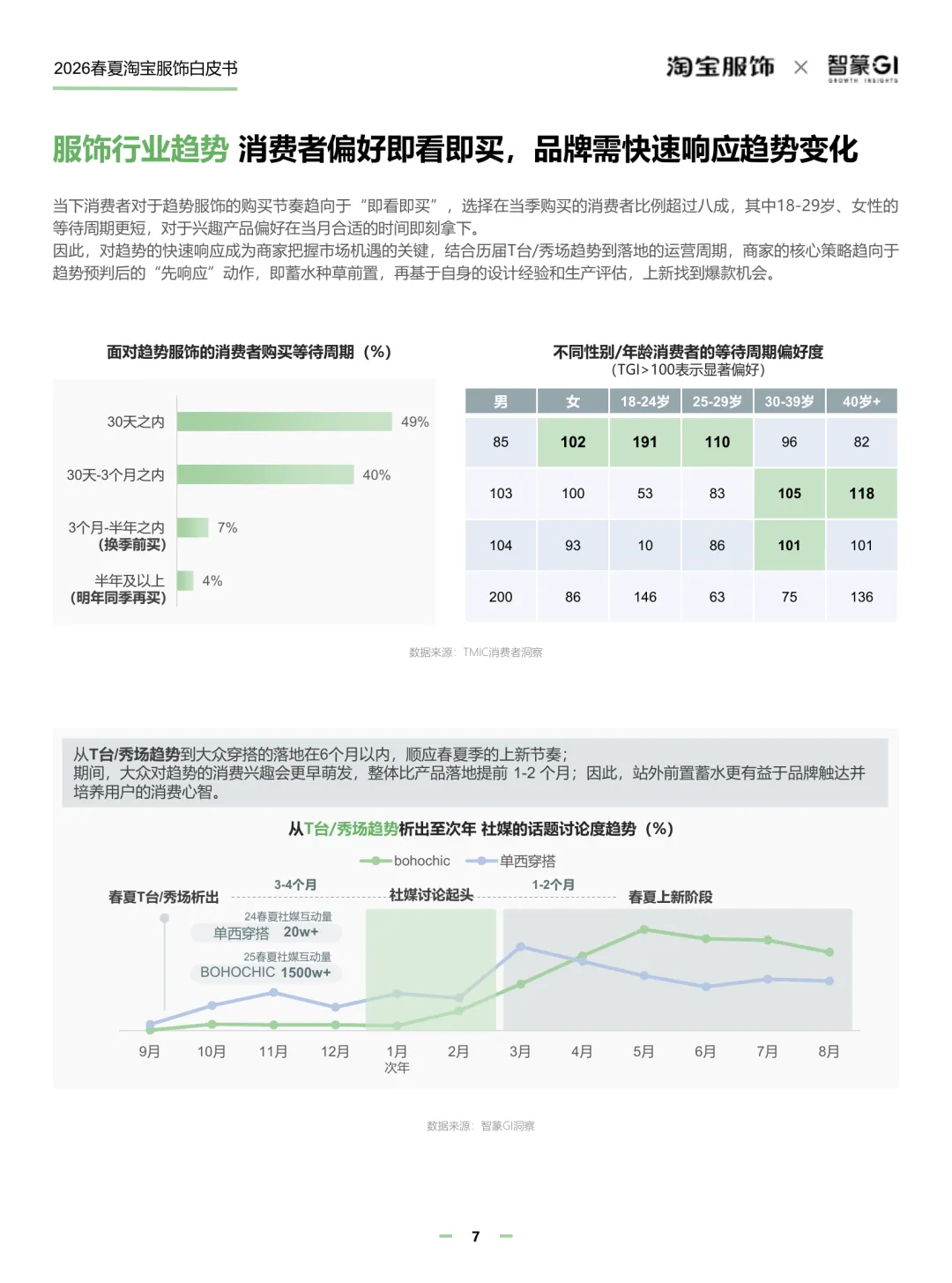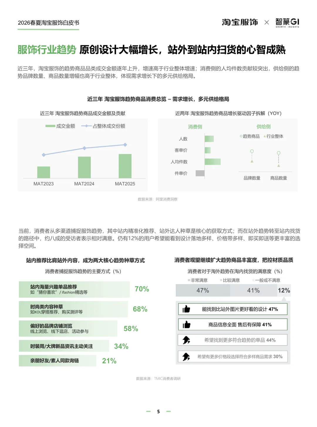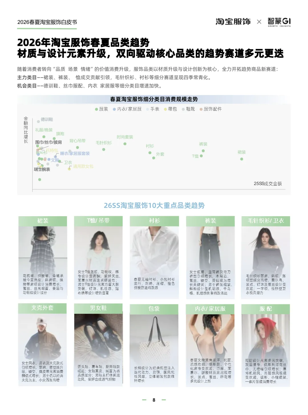 2026年春夏淘宝服饰白皮书指出,随着社会消费信心逐步回升,原创品牌与商家正迎来发展黄金期。凭借独特设计和文化表达,他们持续扩大市场份额。AI技术在智能分析、推荐及素材生成方面深度赋能服饰穿搭,提升“人-衣-场”匹配的精准度和多样性。用户对款式感和风格认同的需求显著增强,推动新品新趋款在平台中快速增长。服饰消费呈现碎片化、场景化趋势,细分领域蕴含巨大潜力,只有快速响应变化的商家才能把握增长机遇。2026年春夏,淘宝服饰将强化新品新趋扶持,构建从趋势洞察到快速响应、精准匹配的全链路体系,助力商家抓住市场机会。平台将继续与商家协同,推动中国设计融入日常穿着。服饰行业正处于不断演变之中,消费者需求从“穿得好看”转向“穿得出片”“穿得有态度”,更注重情绪表达与价值认同。功能面料逐渐从专业运动走向日常,科技元素与时尚设计深度融合,次元文化与潮流服饰相互交融,推动服饰边界不断拓展。平台将持续支持原创商家,从“卖货”向“造风格”和“创风口”转型,以设计为语言,以创新为内核,打造具有辨识度的品牌影响力。服饰产业的核心竞争力在于对前沿趋势的长期追踪与精准把握。通过系统性观察趋势变化,转化为产品策略与品牌发展方向,是商家建立长期优势的关键。本次白皮书全面梳理不同品类的趋势路径,帮助商家提前布局,抢占先机。宏观层面,服饰消费整体保持增长态势,大众消费信心稳健。衣着类消费价格指数稳定,消费者心智成熟,对高品质服饰有更高期待。理性消费环境下,市场展现出强大韧性,为品牌拓展品类和提升价格带提供支撑。2024年9月至2025年11月,社会消费品零售总额及纺织品类总额持续上升,居民消费价格指数和衣着类价格指数均保持平稳。