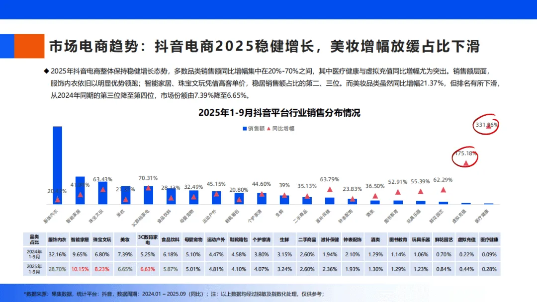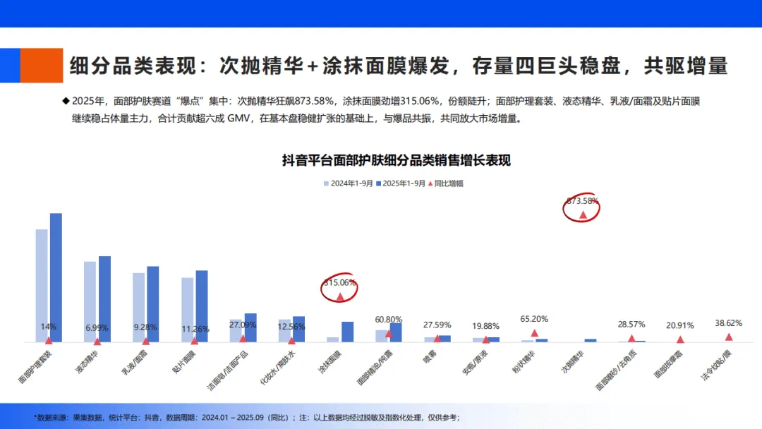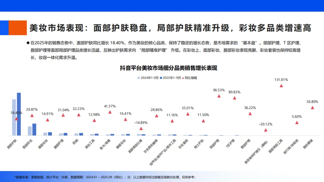 2025年抖音电商整体稳健增长,美妆品类虽同比增幅21.37%,但市场份额从7.39%降至6.65%,排名滑落至第四位。美妆市场内部呈现差异化态势,面部护肤作为核心品类保持18.40%的稳定增长,颈部、T区等局部精准护理品类增速迅猛,彩妆中面部彩妆、唇部彩妆及彩妆套装表现亮眼。