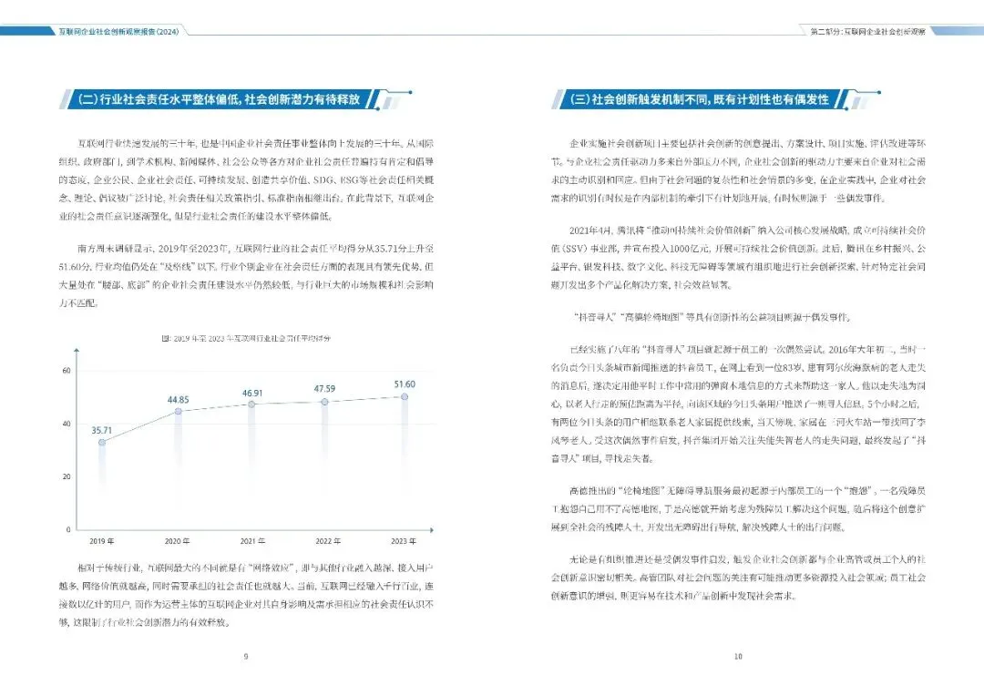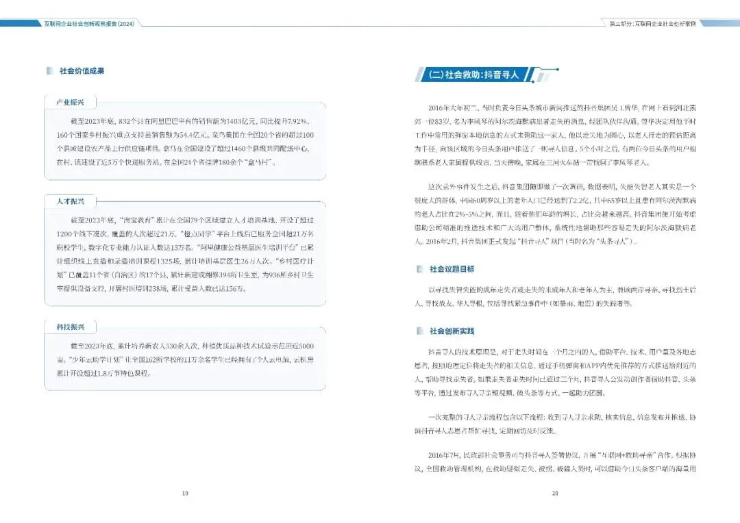 近年来,互联网企业在参与扶贫济困、疫情防控、灾害救援救助等民生改善和社会公共安全治理方面,发挥了积极作用,彰显了行业创造社会价值的巨人潜力。越来越多的互联网企业依托技术优势和跨部门协作,开始在乡村振兴、应对老龄化社会、促进弱势群体发展、助力公共服务均等化等领域,寻求创新性解决方案,形成了企业履行社会责任的新方式,探索出兼具社会目标和商业目标的价值创造新路径。