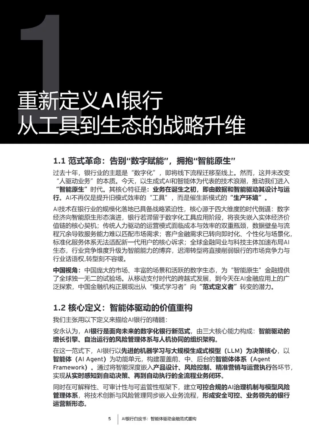 当前,人工智能正从“增效工具”演变为驱动金融业范式革命的核心生产力。本白皮书提出,AI银行的本质是以智能体为基本单元、实现业务从“人驱动流程”到“智能体协同驱动流程”的根本性转变。安永中国构建了“五阶成熟度评估模型”,为中国金融机构描绘了一条从工具化应用到生态化进化的清晰路径。中国在该领域已展现出“加速跑”态势,其“稳妥有序”的政策环境与丰富的场景实践,正为全球智能金融发展提供独特样本。