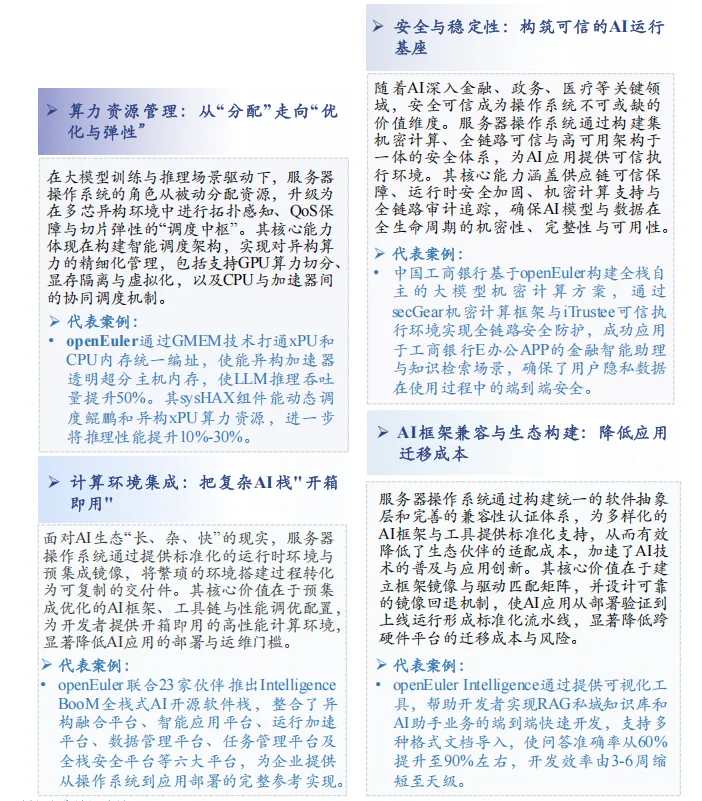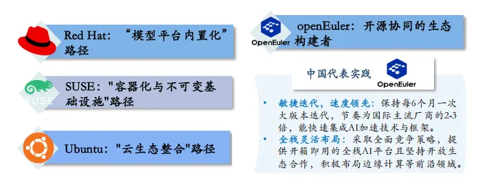 国际服务器操作系统供应商在应对AI技术快速迭代方面普遍采取相对保守的渐进式策,而中国服务器操作系统厂商采取激进创新路线,围绕AI场景深度重构系统架构。在AI场景功能创新方面,中国厂商已实现从“跟跑”到“并跑”的转变。