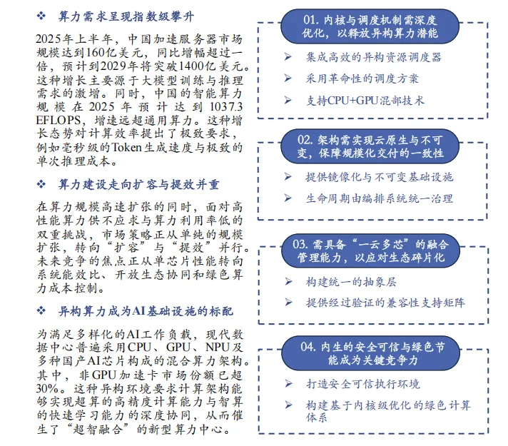 算力需求爆发,异构基础设施加速:智算AI的发展呈现出算力需求指数性增长、算力建设扩容与提效并重、基础设施异构化等显著特征,直接驱动了服务器操作系统技术范式的变革。