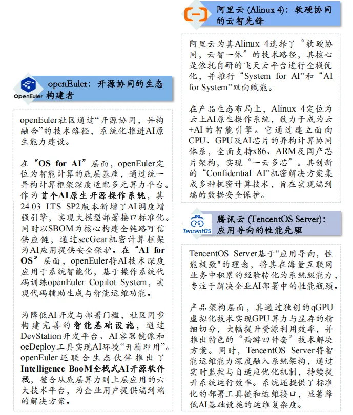 中国服务器操作系统市场的核心参与者在“适配矩阵、交付方式、行业化能力”上同向推进,在智算AI的赛道上展现出差异化的竞争策略。