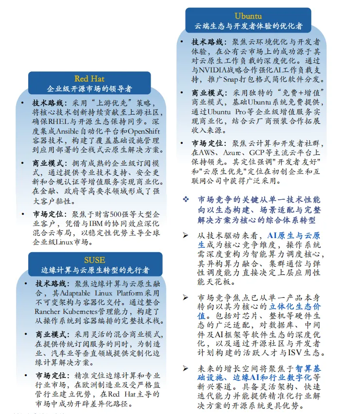 - 全球格局:全球市场由 Red Hat、SUSE、Canonical 主导,国际厂商以渐进式策略应对 AI 趋势,而中国厂商凭借快速迭代实现弯道超车;全球增长重心向中东、亚太、非洲等新兴市场转移,为国产系统带来国际化机遇,中国厂商需围绕技术、生态、合规、社区制定差异化国际化策略。