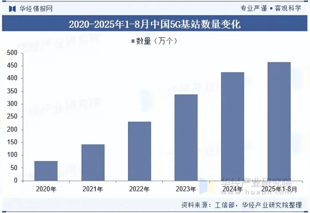 5G 基站数量上涨直接推动基站天线需求扩容、技术升级与产品结构调整,带动中国基站天线行业需求持续上涨,数据显示,2025年1-8月中国5G基站数量约为464.6万个。