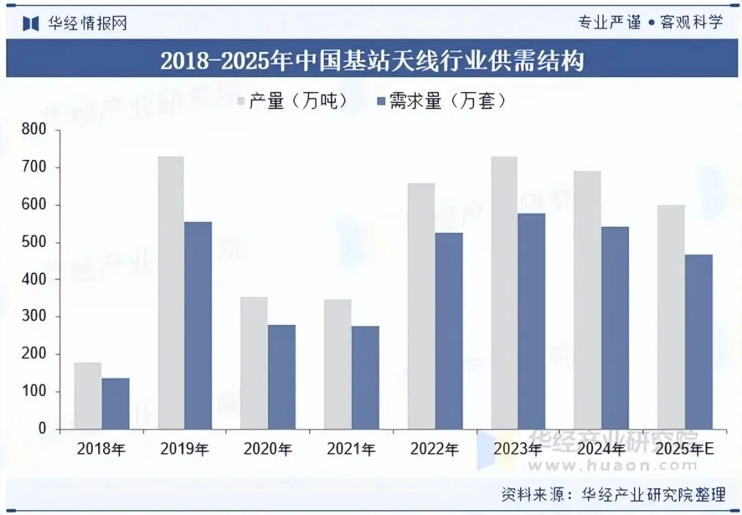 随着智能家居、智能交通、智能医疗等物联网应用的广泛普及,物联网设备数量将实现爆发式增长,需要稳定的网络连接,为基站天线市场带来了新的需求增长点。数据显示,2024年中国基站天线行业产量为693.1万吨,需求量约为543.6万吨。