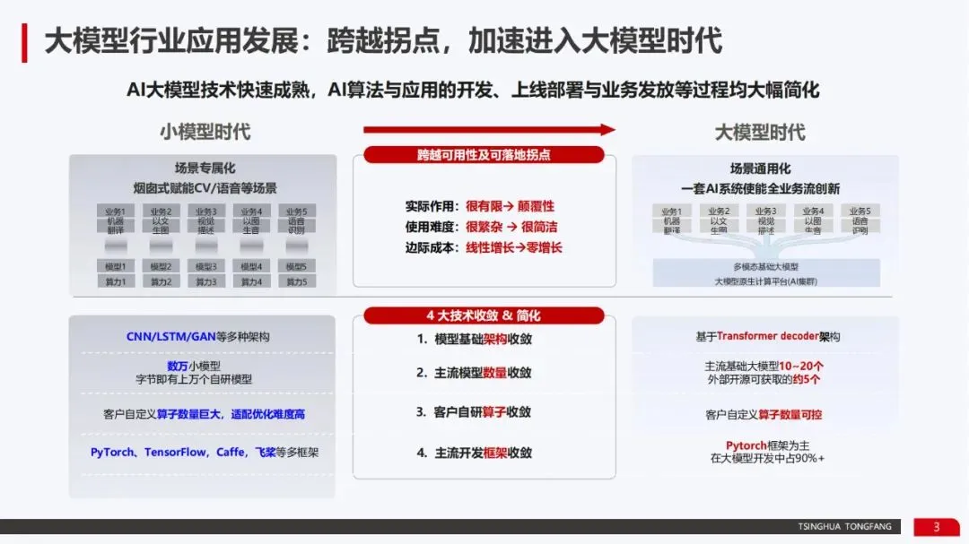技术收敛与简化:相较于“小模型时代”CNN/LSTM/GAN等多种架构并存的复杂局面,大模型时代呈现出“四大收敛”趋势: