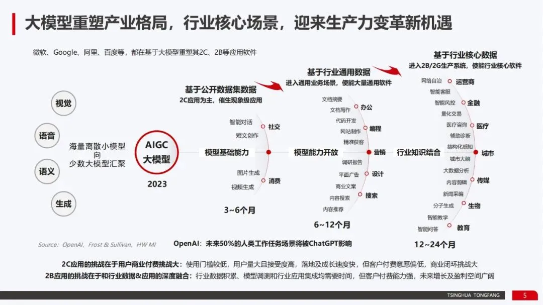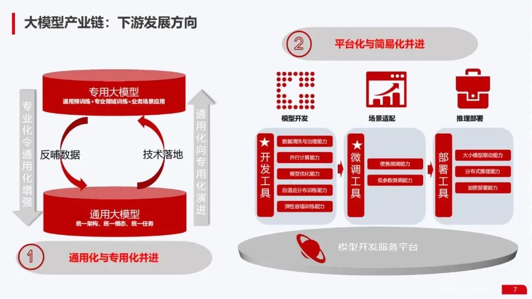 市场格局重塑:微软、Google、阿里、百度等科技巨头正基于大模型重塑其2C/2B应用软件。市场呈现出通用化与专用化并进、平台化与简易化并进的趋势。下游发展方向是“通用预训练+专业领域训练=业务场景应用”的专用大模型,以及统一架构的通用大模型。