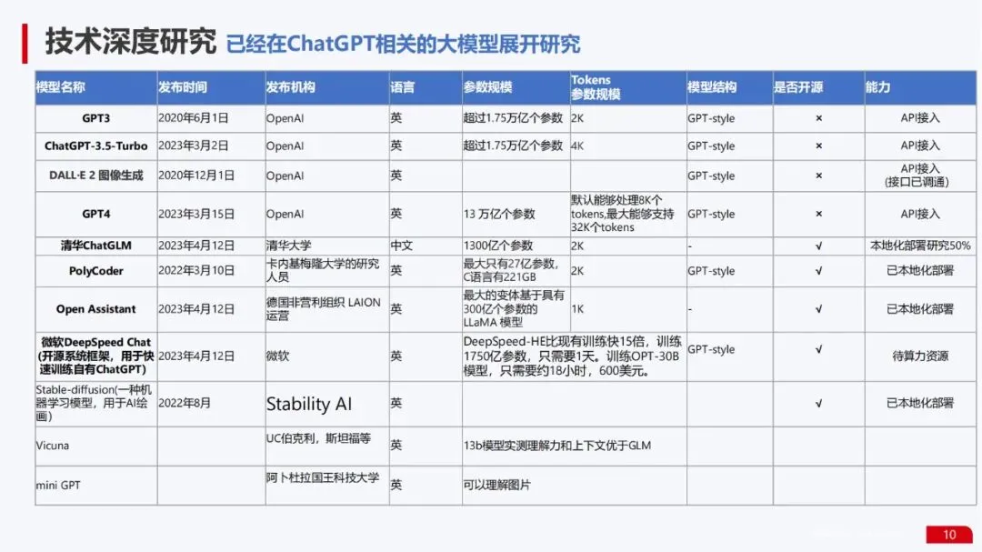 大模型研究能力:已对主流大模型展开深度研究与实践。其研究覆盖了从GPT系列、ChatGLM到Stable-diffusion等各类模型,并已实现部分模型(如PolyCoder, Open Assistant)的本地化部署。