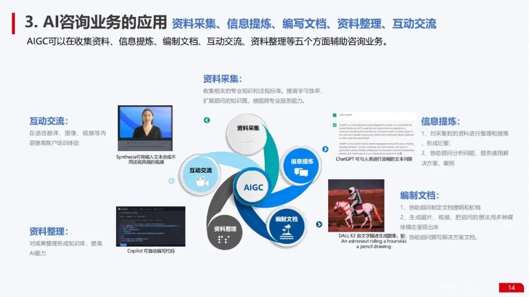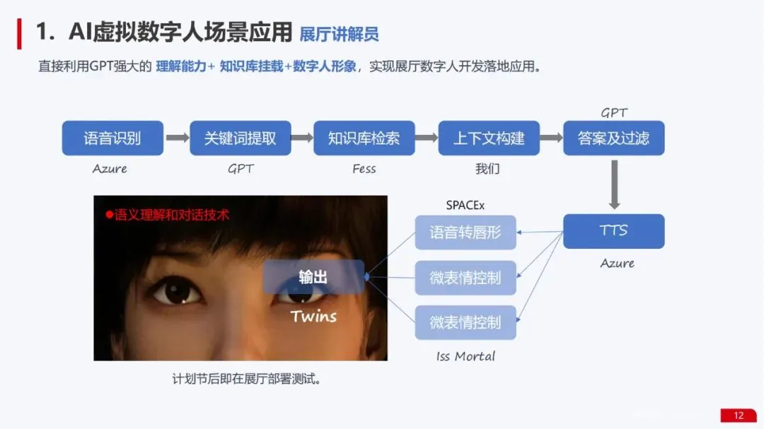 应用方案落地能力:展示了在AI虚拟数字人(如展厅讲解员)、AI数字孪生建模(基于照片阵列和语义分割技术实现3D自动建模)、AI咨询业务(资料采集、信息提炼、文档编写等)等多个场景的成熟应用方案。